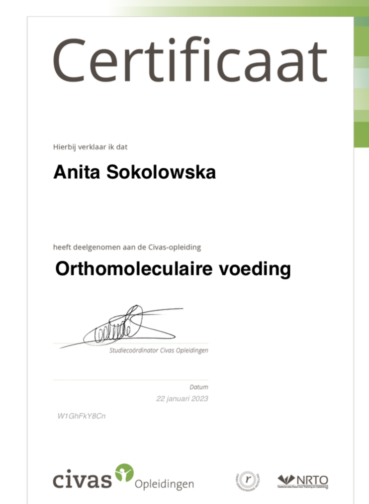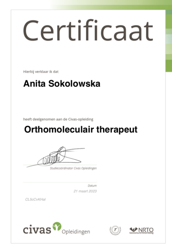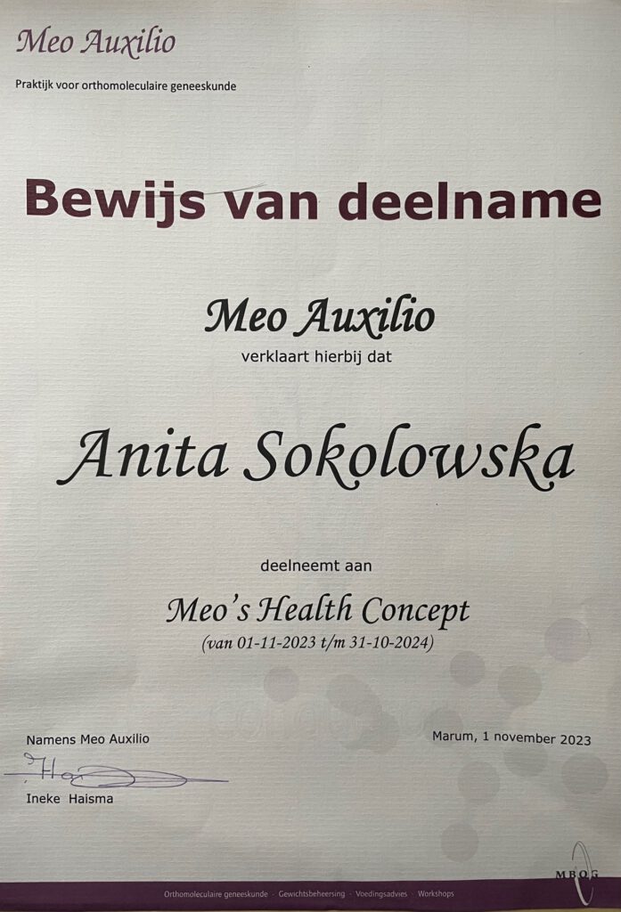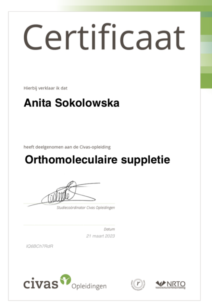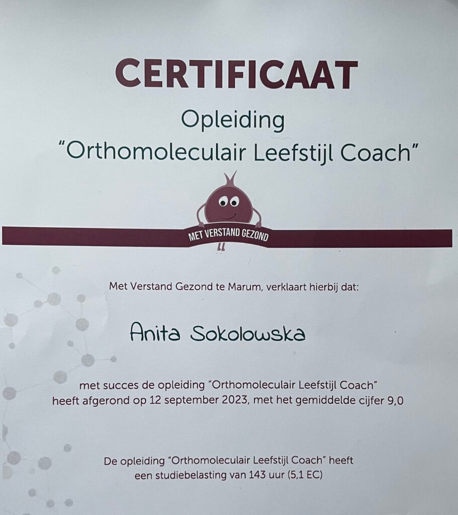 Ik ben mij gaan verdiepen in wat voeding en een gezonde leefstijl met je doet en heb de opleiding tot orthomoleculaire therapeut afgerond. Na deze verrijking ging ik me verdiepen in de wereld van de kruidengeneeskunde. Kruiden waren bij mij thuis in Polen onderdeel van de dagelijkse voeding en verzorging. Deze gebruikten we ook medicinaal.